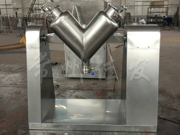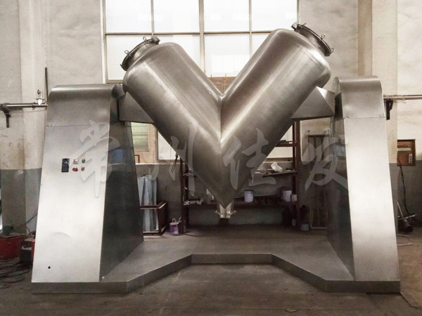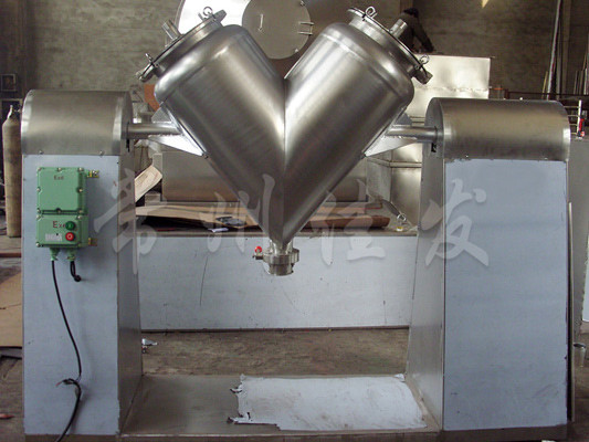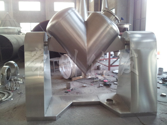 該機通過機械傳動,使不對稱的V型圓柱體內(nèi)的物料做往復(fù)翻動,達到均勻混合之目的。