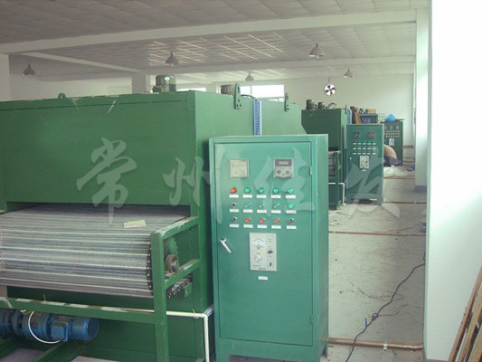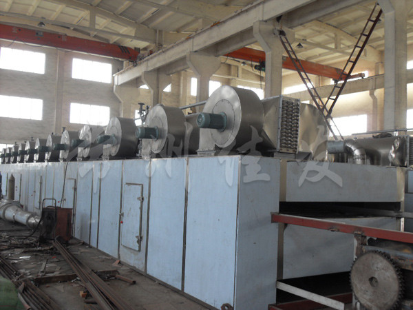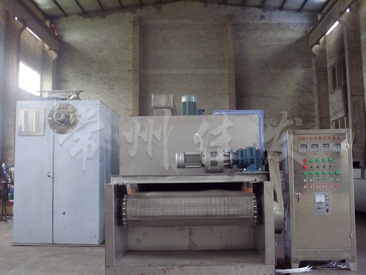 物料由加料器均勻地鋪在網(wǎng)帶上,網(wǎng)帶一般采用12-60目不銹鋼絲網(wǎng),由傳動裝置拖動在干燥機(jī)內(nèi)移動。干燥機(jī)由若干單元組成,每一單元熱風(fēng)獨(dú)立循環(huán),部分尾氣由專門濕風(fēng)機(jī)排出,廢氣由調(diào)節(jié)閥控制,熱氣由下往上或由上往下穿過鋪滿物料的網(wǎng)帶完成熱量與質(zhì)量傳遞的進(jìn)程,帶走物料的水份。網(wǎng)帶緩慢移動,運(yùn)行速度可根據(jù)物料溫度自動調(diào)節(jié),干燥后的成品連續(xù)落入收料器中。上下循環(huán)單元根據(jù)用戶需要可靈活配備,單元數(shù)量亦可根據(jù)需要選取。
