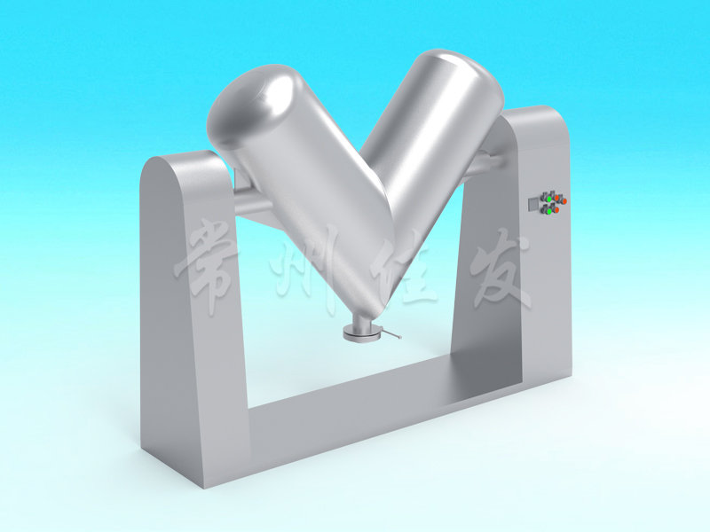 該機(jī)通過(guò)機(jī)械傳動(dòng),使不對(duì)稱(chēng)的V型圓柱體內(nèi)的物料做往復(fù)翻動(dòng),達(dá)到均勻混合之目的。